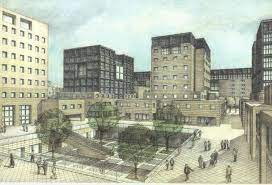 Esse limitano il fronte e richiamano una presenza antica. All'interno ci sono delle corti residenziali formate da edifici di varia dimensione e altezza, compatibili con le tipologie dei nostri centri storici. La loro posizione induce alla continua diversificazione dei prospetti, degli angoli, degli spazi privati e collettivi. Le auto stanno ai margini e sono ospitate parte in un autosilos meccanico, parte a raso e parte interrate. Il supermercato proposto ha la forma dei tipici magazzini in mattoni a falde ma è su due livelli, non appare invadente, è inglobato nel borgo, ha in copertura pannelli fotovoltaici tridimensionali che ne caratterizzano le forme. Anche tratti di mura o bastioni cittadini, con pareti in pietra, sono percorribili in sommità e all'interno delle corti alcune piazzette consentono di mantenere stretti rapporti sociali.